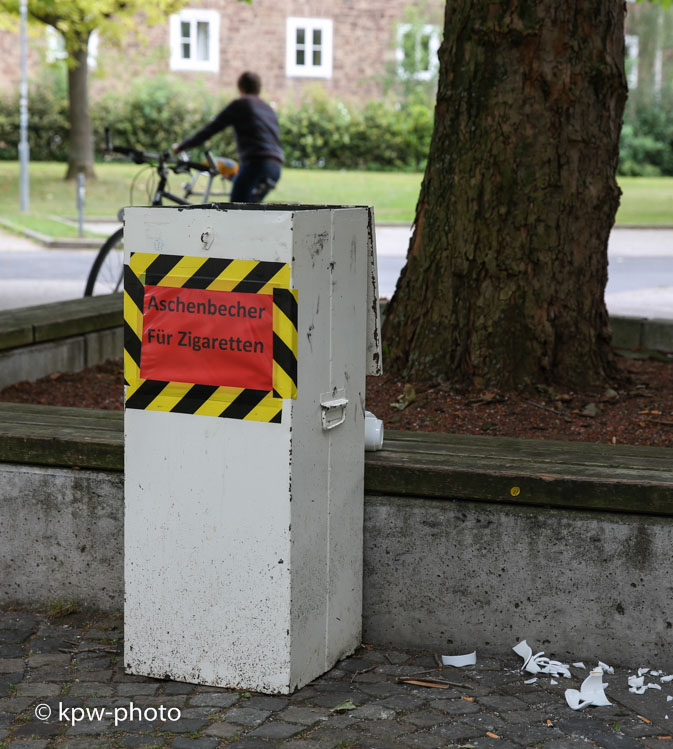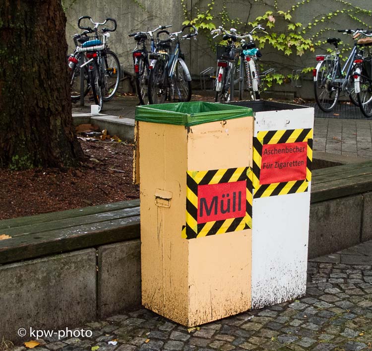 Universität Göttingen im Herbst 2013, Ausgang Blauer Turm zur Burse hin: die RaucherInnen-Bank hat einen neuen soliden Großraum-Aschenbecher ..... |