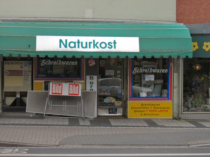 Das wichtige Geschäft war jahrzehntelang das Lebensmittelgeschäft Spielmann, ein nach heutigen Maßstäben kleiner SB-Laden mit dem Ostviertel angepaßtem Sortiment und Preisen. Und kaum Parkplätzen. Boyer, der hier abgebildete Anbieter von Lebensmitteln mit Schwerpunkt auf Naturkost, war nur für eine Übergangszeit in diesem Komplex vertreten. |