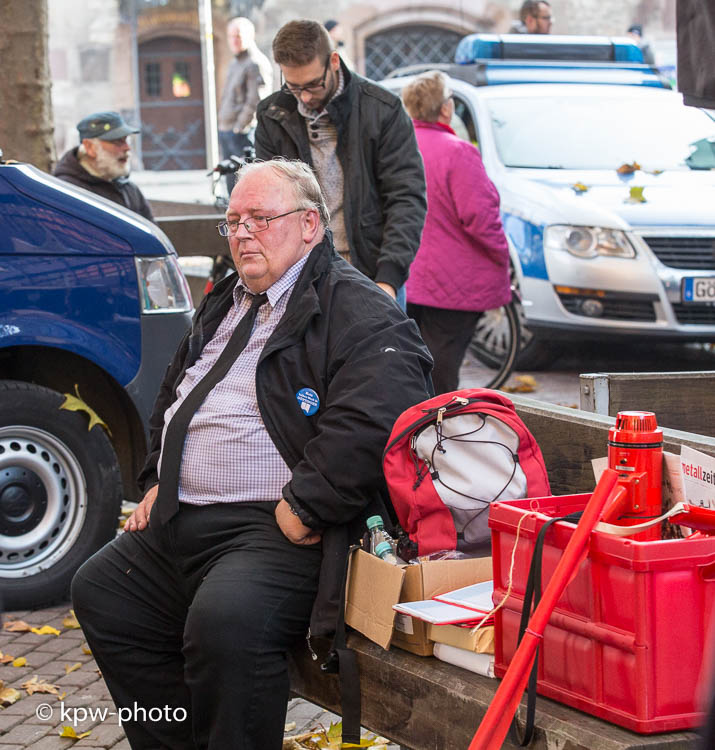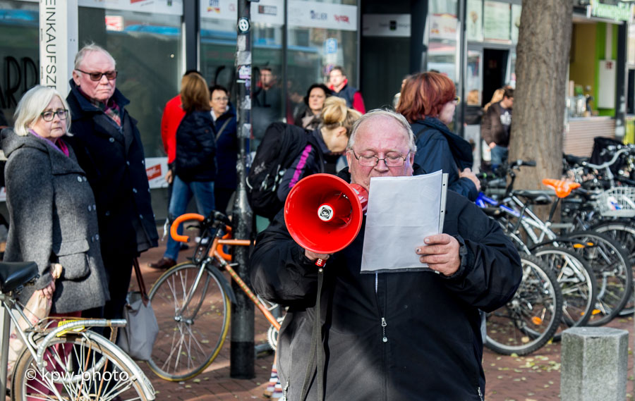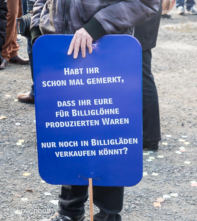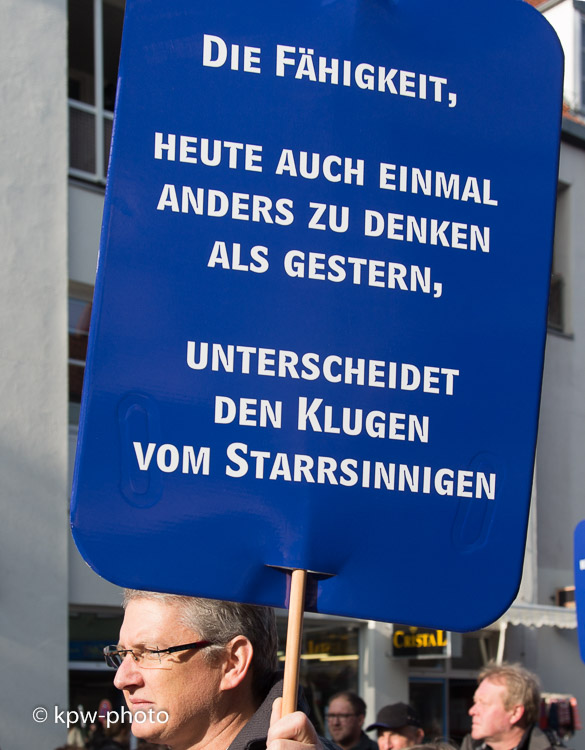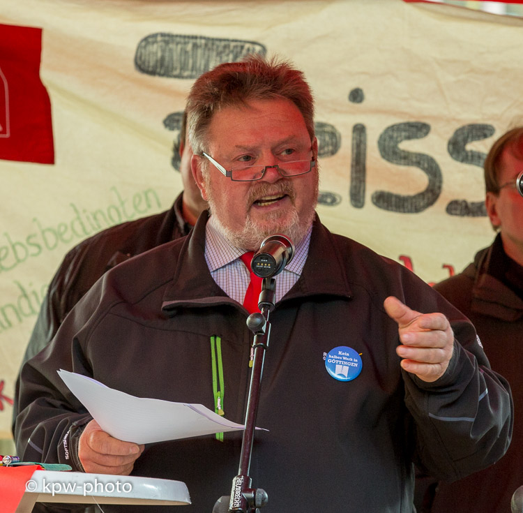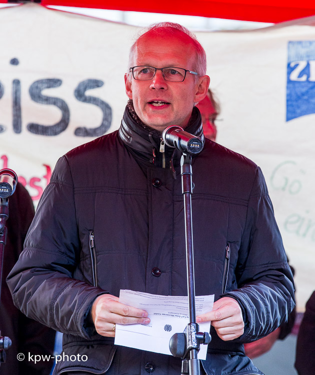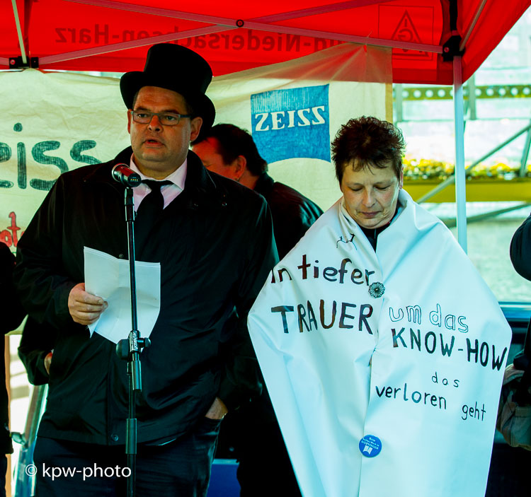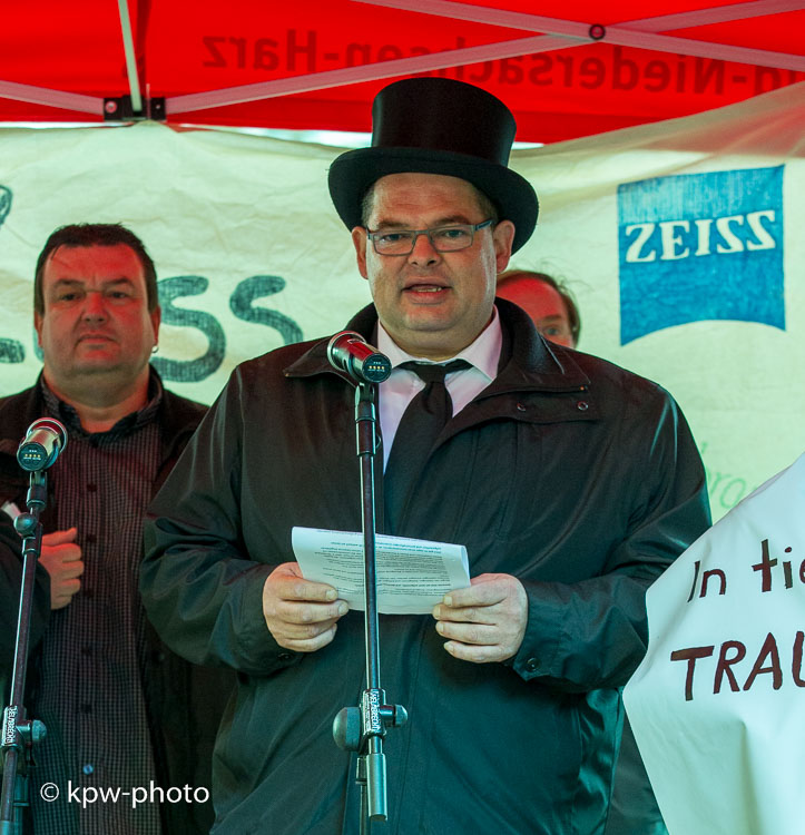 Die Prostestformen sind vielfältig: der stellvertretende Vorsitzende des Göttinger Zeiss-Betriebsrates, Reinhard Dickehuth, hat die Probleme und Forderungen der Belegschaft in Reimform gebracht und trägt sie am Rande der Demonstration immer wieder vor. |
