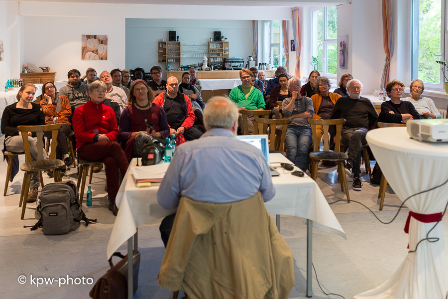 Petra Köster (Regionsleitung Arbeit und Leben) begrüßt den Referenten Joachim Bons und die Zuhörer |