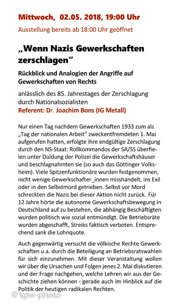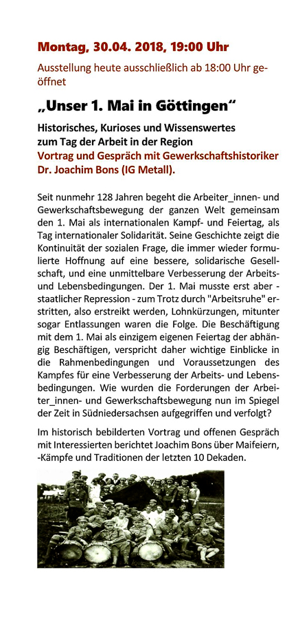 | DGB Göttingen: Geschichte der Erste-Mai-Feier in Göttingen - 30. April 2018 | Final: 8.5.2018 |