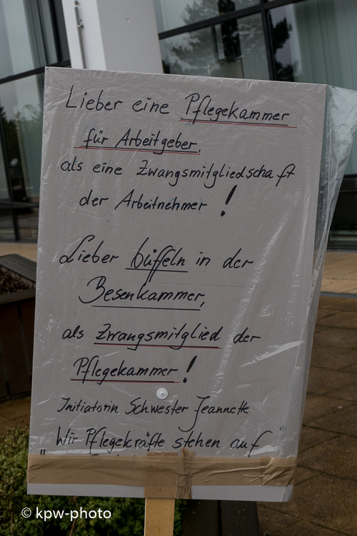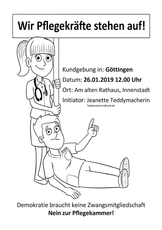 Am Samstag, den 12. Januar 2019 fand ab 12:00 Uhr vor dem Westeingang des UMG Klinikums Göttingen eine Protestkundgebung gegen die Pflegekammer Niedersachsen statt. Die Veranstalter der Kundgebung organisiseren sich in der Facebook-Gruppe "Wir Pflegekräfte stehen auf! Auch wenn die Pflege am Boden ist" |