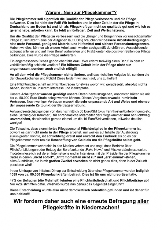 Der Test der Facebookgruppe: Stand 14.1.2019 "Der Text ist lang aber dennoch bis zum Ende lesen... Wir wollen als Berufsgruppe wahrgenommen werden. Diese Gruppe soll ein Ort sein, an dem wir uns austauschen können. Ein Ort an dem wir uns verabreden um mehr zu sein als nur der einzelne. Wir allen wollen bessere Arbeitsbedingungen, wir wollen mehr Gehalt und bessere Personalschlüssel. Es ist völlig egal ob du Gewerkschaft X oder Y oder Z angehörst um deiner Stimme Ton und Lautstärke zu geben. Du musst kein Mitglied sein um hier in der Gruppe aktiv zu sein, du kannst an allen Aktionen und Veranstaltungen der einzelnen Gewerkschaften teilnehmen. Hauptsache ist , du nimmst daran Teil und wenn du kein Frei hast, dann informier deine Kollegen. Wir sind alle nur so laut wie der einzelne es sein kann. Bist du bereit laut zu sein? Bist du bereit aufzustehen? Bist du bereit für uns als Berufsgruppe mit gerade zu stehen? Wir wollen hier den Raum geben um konstruktiv zu sein und nicht nur sagen „ah geht nicht“ doch es geht und wir werden es schaffen! Es kann durchaus passieren, dass Dir hier in dieser Gruppe Menschen begegnen, die ProKammer sind, doch auch die haben das Ziel mehr Geld, Personal und bessere Bedingungen zu erreichen. Es werden keine ProAktionen gepostet oder verbreitet aber auch jemand der die Kammer befürwortet, darf an Aktionen für bessere Bezahlung, für mehr Personal und für bessere Bedingungen teilnehmen und sich hier darüber informieren. Bei einer Dienstbesprechung beleidigt ihre eure Kollegen auch nicht , weil sie anderer Meinung sind, ihr bedroht sie nicht und beschimpft sie nicht - Hier auch nicht!!! Die Kammer darf uns als Berufsgruppe nicht in 2 Lager spalten wenn es um mehr geht! Des Weiteren ist diese Gruppe kein Ort zum lästern, Dir passt das Hemd nicht das jemand trägt? Dir passt die Brille nicht die jemand auf der Nase hat? Es ist egal! Äußerlichkeiten sind nix wonach man jemanden beurteilen kann und darf! Hier auch nicht, wir verwarnen und entfernen aus der Gruppe bei unsachlichen Diskusionen! Was wir definitiv nicht wollen ist rechte Hetze, Beleidigungen oder bewusste Falschmeldungen. Da wir Admins alle ein Leben außerhalb von Facebook haben, warnen wir schon mal vor, dass es auch mal dauern kann bis Beiträge freigeschaltet werden. Nur wer die Fragen beantwortet, wird reingelassen" |