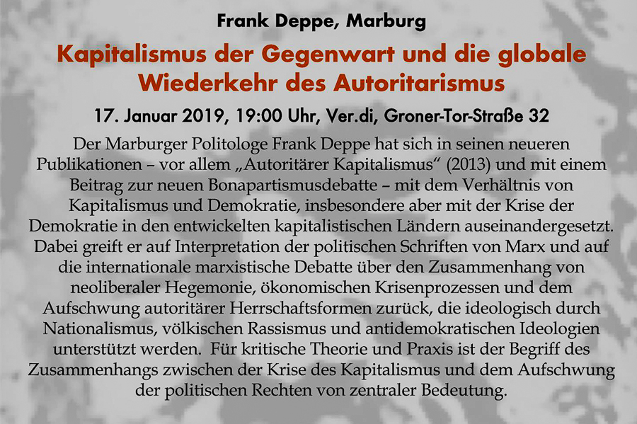 Frank Deppe: Kapitalismus der Gegenwart und die globale Wiederkehr des Autoritarismus 17. Januar 2019 |