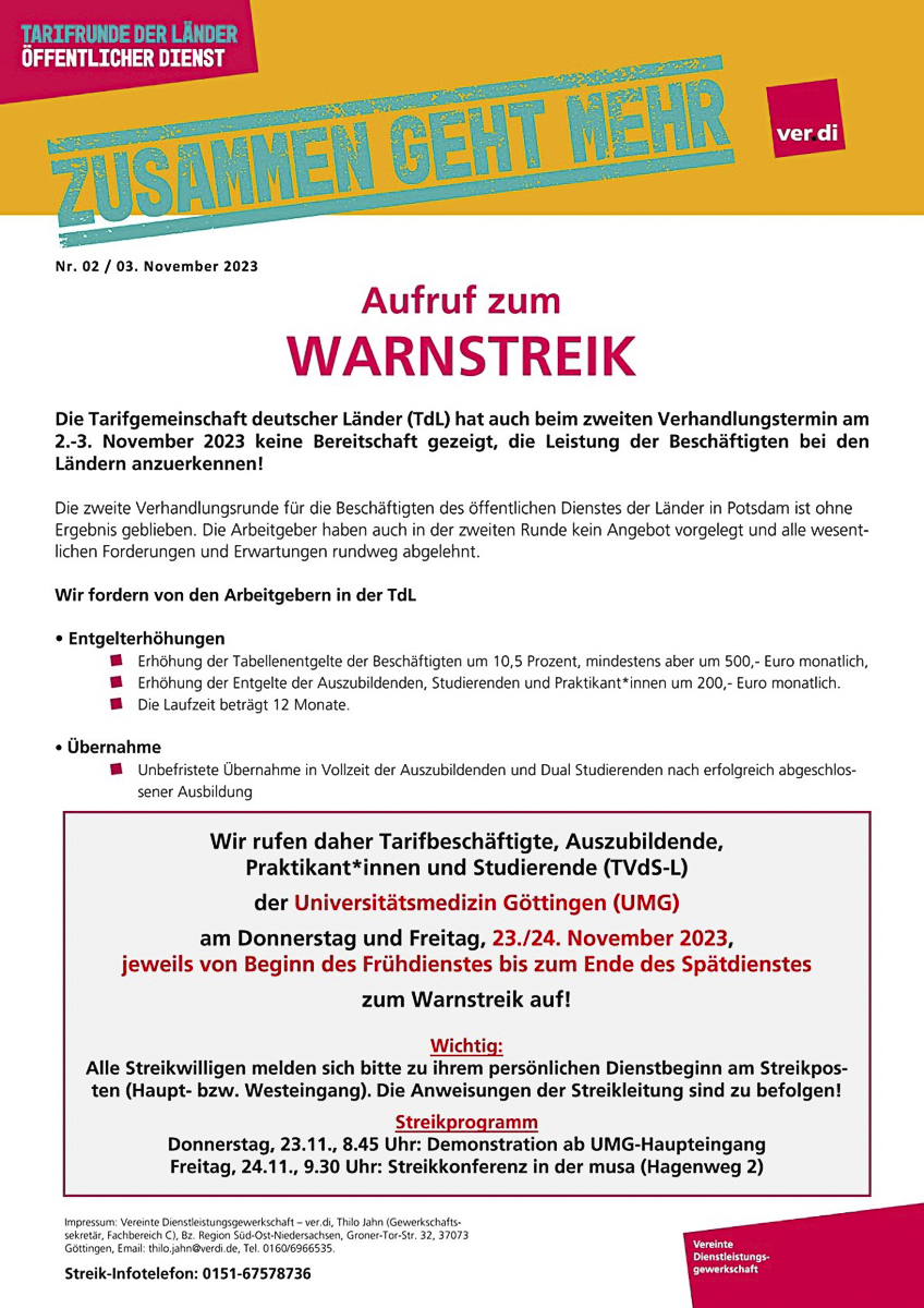 Tarifrunde Öffentlicher Dienst der Länder - verdi-Aktion in Göttingen am 23. November 2023