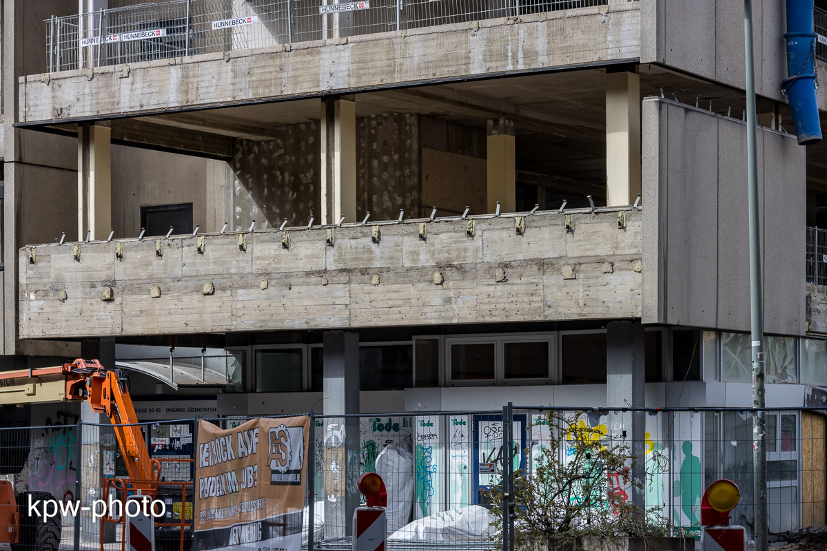 Die Fassade ist hier demontiert, die Träger und Stützen sind sichtbar |
