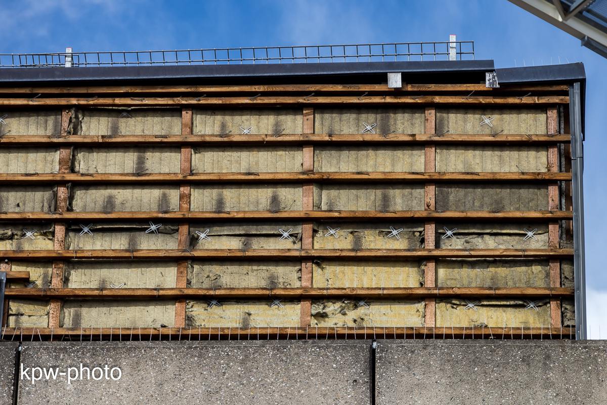 Links im Bild die sichtbare Fassade, rechts sind die äußersten Abdeckplatten bereits entfernt |