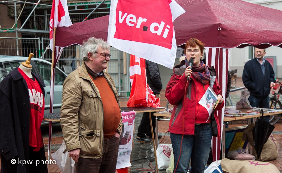 Klaus Schild (Vorsitzender des Verdi-Ortsvereins Göttingen); Monika Neuner (Verdi Bezirk Region Süd-Ost-Niedersachsen, Fachbereich 12 - Handel) berichtet von der Aufklärungsaktion in Geschäften des Einzelhandels in Göttingen am 13. April 2013 |