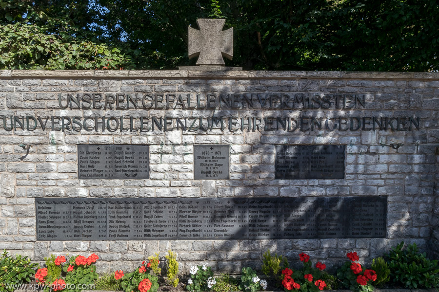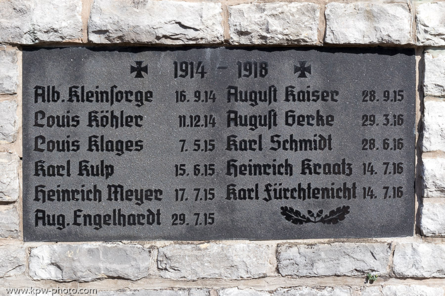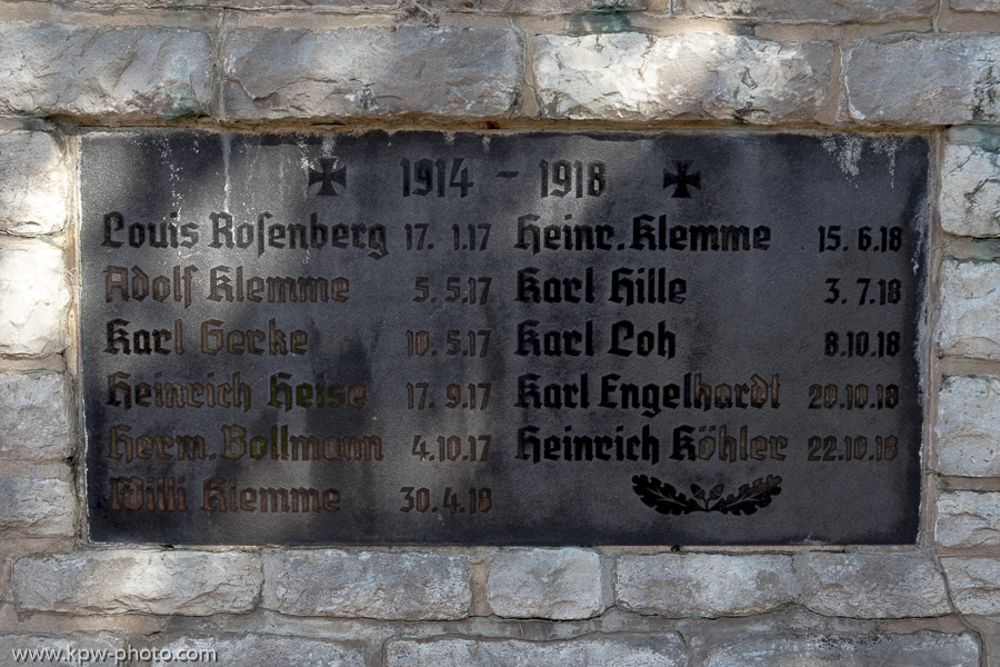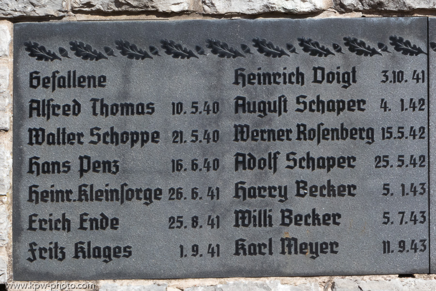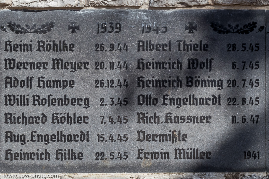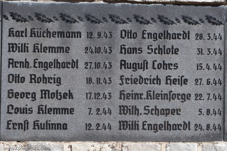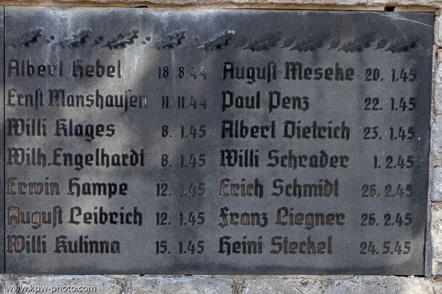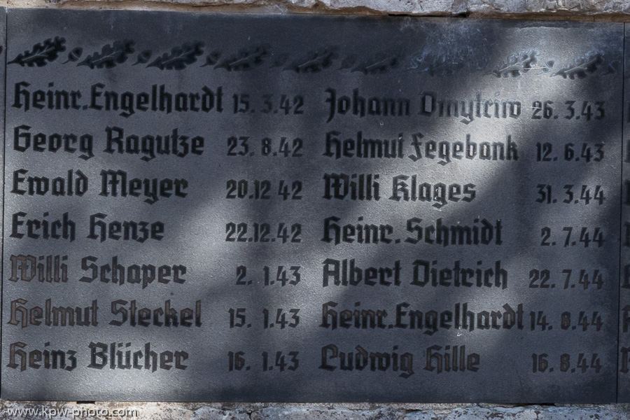 Für den 2. Weltkrieg wird der Tod von 4 Einwohnern einfach registriert. Dazu nutzt man den vorhandenen Stein (zwei Seiten sind noch zu vergeben). Der Unterschied der kriegsführenden Regime scheint (so vermute ich) hier auf. |