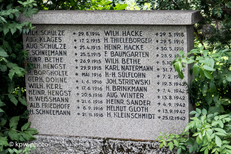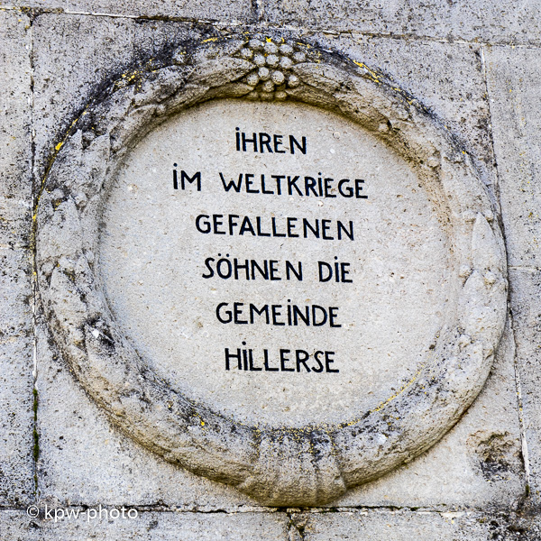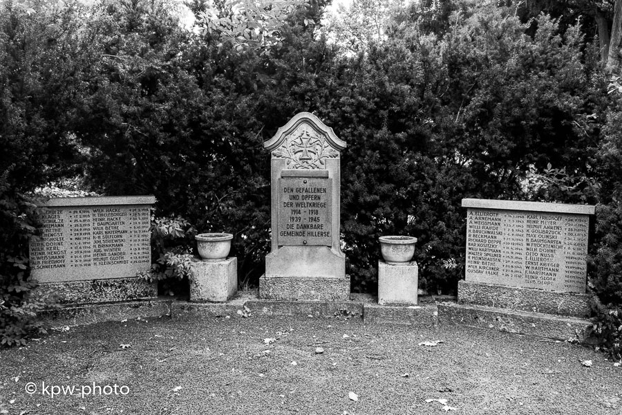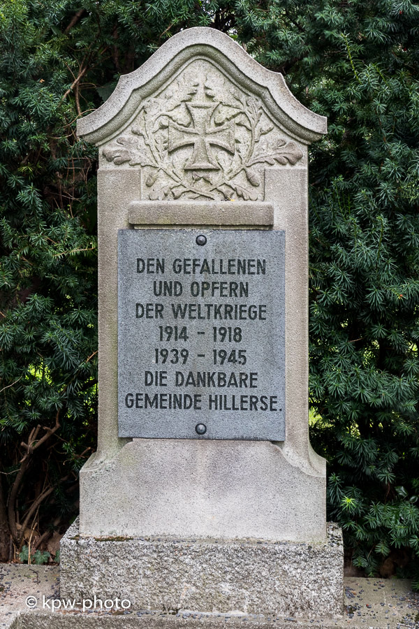 Die Gemeinde Hillerse errichtete 1921 auf dem Wartberg eine noch heute bestehende Gedenkstätte für die Gefallenen des (I.) Weltkrieges; diese Gedenkstätte wurde im II. Weltkrieg durch Bombensplitter beschädigt. In den 1960er Jahren wurde eine neue Gedenkstätte auf dem Alten Friedhof errichtet, die hier abgebildet ist. Bei den Gefallenen sind auch diejenigen aufgeführt, deren Angehörige als Flüchtlinge nach dem II. Weltkrieg in Hillerse wohnhaft wurden. |
