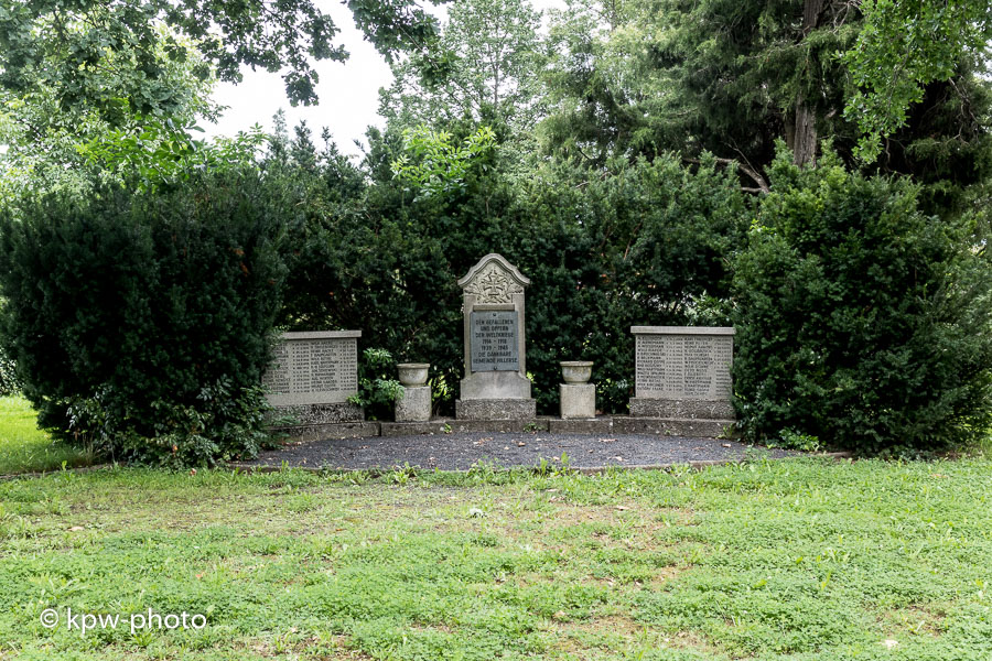 Die Namenstafeln sind chronologisch angeordnet; durch die Neuanlage in den 1960er Jahren gibt es keine getrennten Tafeln für die beiden Weltkriege. 18 Gefallene des I. Weltkrieges und 30 Gefallene sowie 7 Vermisste des II. Weltkrieges werden aufgeführt. |