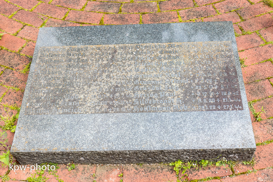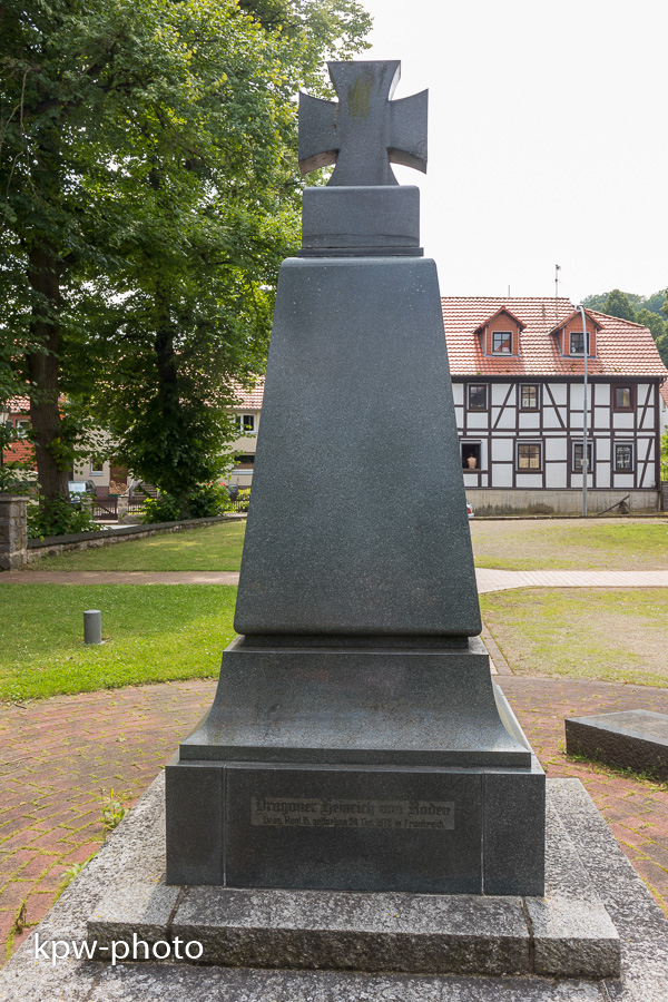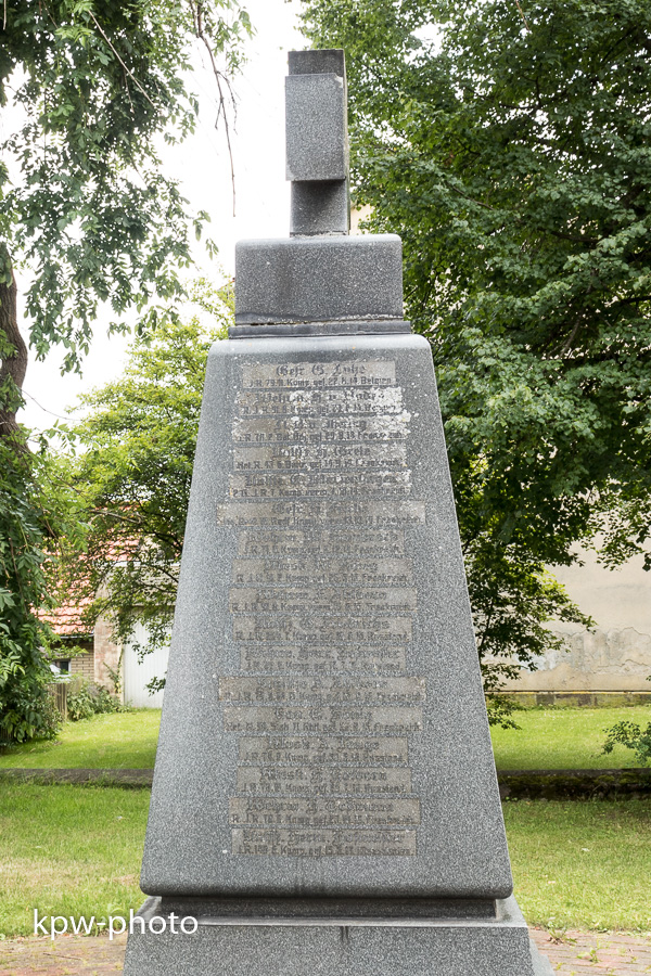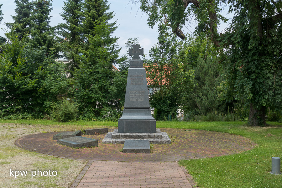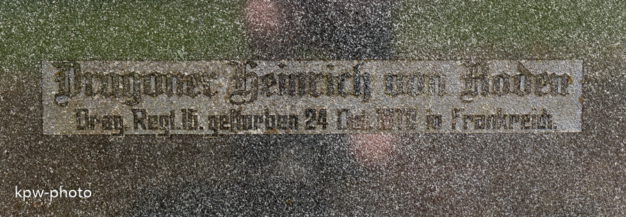 Hier findet sich ein Hinweis auf einen Toten des Krieges 1870/71. Genannt werden Dienstgrad, Truppenteil, Todesdatum und Ort (Land); dies entspricht den Angaben für die Toten des Ersten Weltkriegs. Auffällig ist "gestorben" an Stelle von "gefallen". Ob es eine ältere Gedenkstätte gibt, ist noch zu klären. |