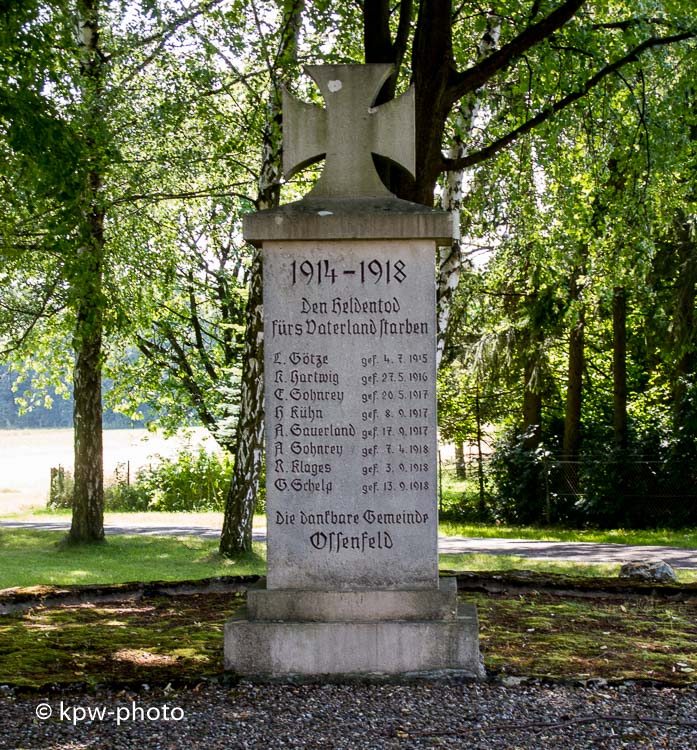 Gedenkanlage für die Gefallenen des 1. und des 2. Weltkrieges in Ossenfeld, einem Ortsteil der Gemeinde Dransfeld im Landkreis Göttingen. Die Anlage liegt am Ortsrand und nicht im Kirchenumfeld. |