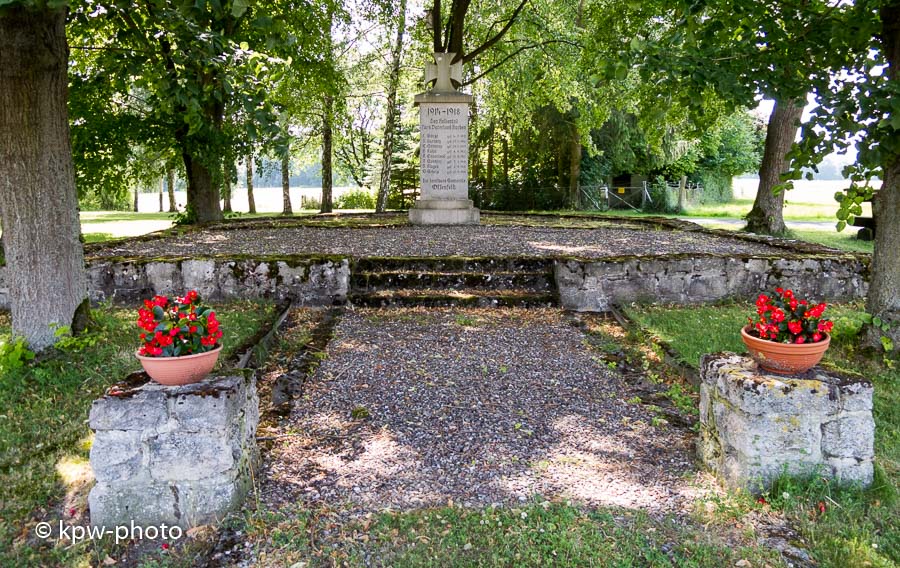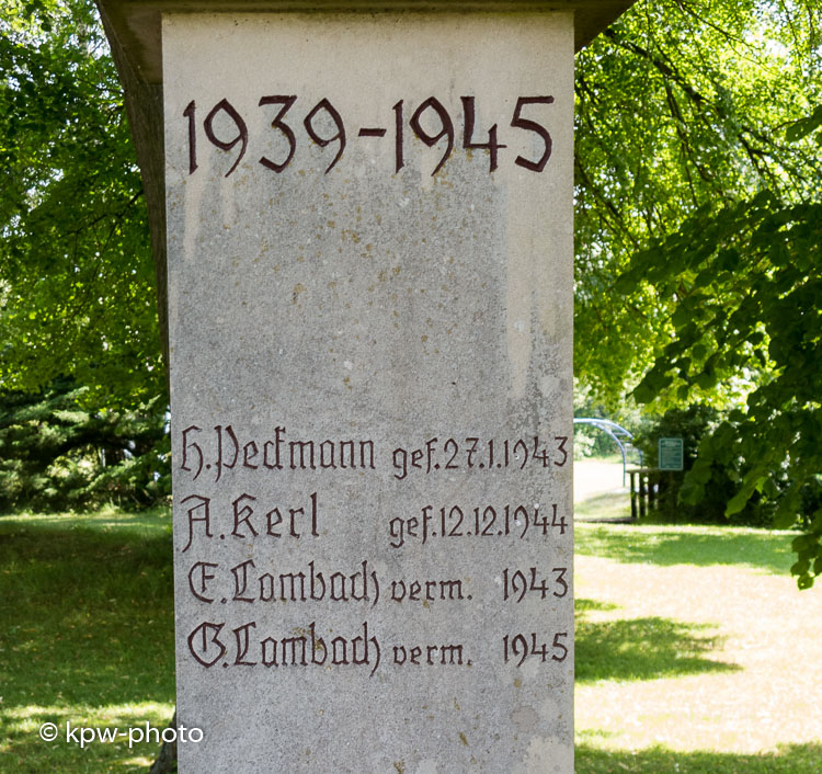 Im (I.) Weltkrieg, wie er zunächst genannt wurde, starb man "den Heldentod fürs Vaterland", und die Gemeinde, die 8 Einwohner einbüßte, war dankbar. Es werden Name und Todesdatum genannt, keine Dienstgrad, Einheiten oder Orte. | |