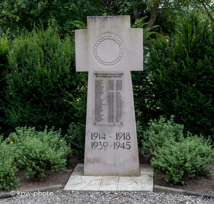 Entgegen der Inschrift auf dem Stein selbst werden auf der aufgesetzten Platte nur Daten zum II. Weltkrieg genannt. |