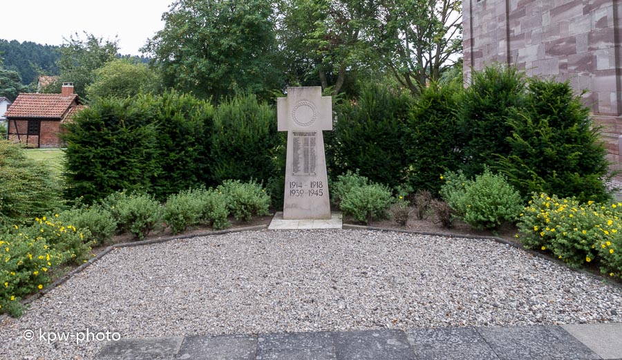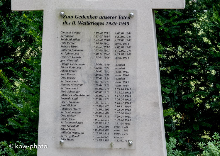 Die Überschrift "Zum Gedenken unserer Toten des II. Weltkrieges" ist rein sachlich-deskriptiv und kommt ohne Helden und Vaterland aus. Genannt werden Name, Geburts- und Todestag. Neben "vermisst" kommt das "gef = gefallen" nicht vor, auch nicht als Symbol. Bei fünf Namen liegt der Todestag nach Kriegsende. Die Tafel ist offensichtlich jüngeren Datums und sollte mit der ersten Version auf der Nachkriegszeit verglichen werden. Da Renshausen zur katholischen Diaspora des Eichsfeldes gehört, ist auch der Frage nachzugehen, welche Rolle die Konfession bei der Erinnerungspolitik im Laufe der Zeit gespielt hat. |