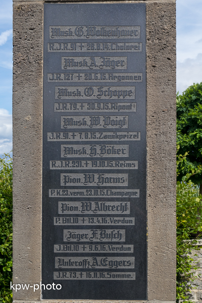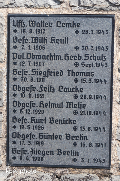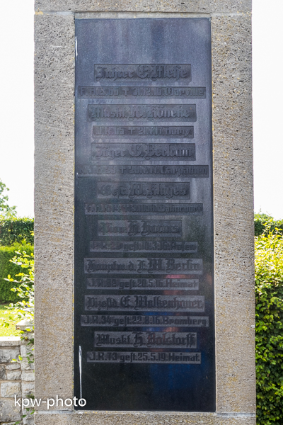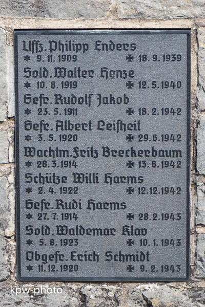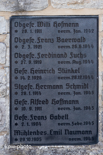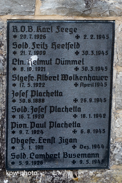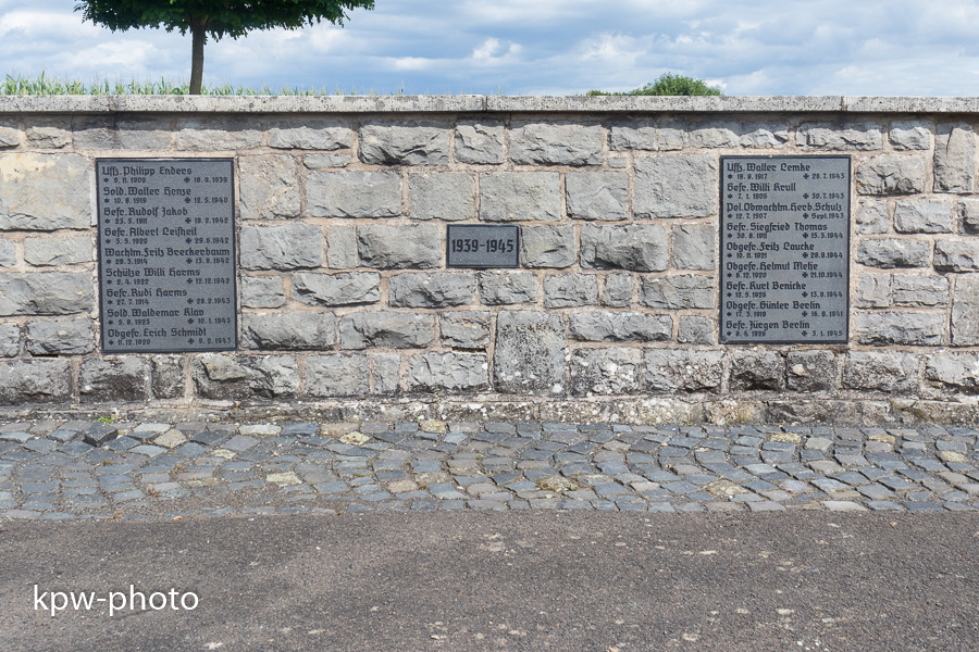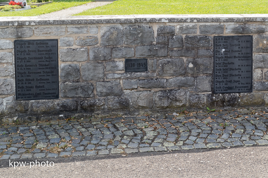 Die Namenstafeln für die Gefallenen des Zweiten Weltkriegs sind nicht in die alte Gedenksäule integriet, sondern finden sich an der Umfassungsmauer derm Gedenkstätte |