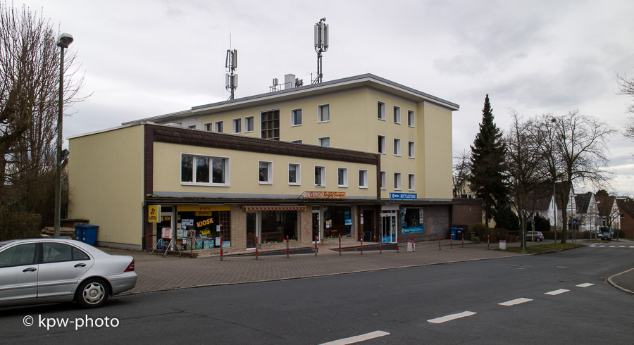 Die Ladenzeile mit drei Geschäften liegt in einem Neubauteil des Ostviertels. Bei der Planung des Gebietes waren solche Ladenzeilen für fußläufige Nahversorgung vorgesehen, vermutlich in der Kombination Lebensmittel, Schlachter und Bäcker. Die auf der anderen Seite liegende Jugendherberge bescherte weitere Kunden. - Die Belegungsgeschichte dieser Ladenzeile ist hier nicht im Einzelnen zu rekonstruieren, dürfte aber durch die verbesserten Möglichkeiten häuslicher Vorratshaltung (=Kühlschrank) und den Erfolg größerer Selbstbedienungs-Verkaufsflächen geprägt sein, später dann durch den Wocheneinkauf per Auto. Gründete sich das Ladenzeilenkonzept auf den täglichen Einkauf, so trat mit diesem in den Hintergrund. Für den Ergänzungseinkauf hielt sich der Lebensmittelladen bis (mindestens) in die 1990er Jahre. | |