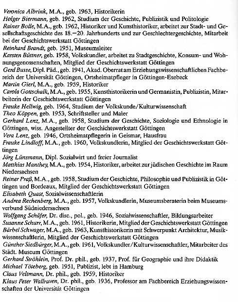 Meine weitergehende Idee wäre, die (noch breiter zu erfassenden) Veränderungen mit einer Bestandsaufnahme zu ergänzen, die periodisch wiederholt werden sollte - eine Art photographischer Langzeitbeobachtung. Diese sollte aber durch Texte ergänzt werden. Damit der damit gesetzte Anspruch nicht zu hoch und dann erdrückend wird, würde ich mich an dem Buch "Göttingen zu Fuß" orientieren, das m. E. das Konzept eines sozialhistorischen Stadtreiseführers ziemlich gut realisiert hat. Mit den heutigen Mitteln ließen sich Bilder und Texte über GPS-Daten nutzerfreundlich verorten. |