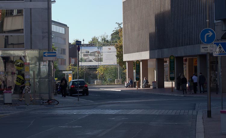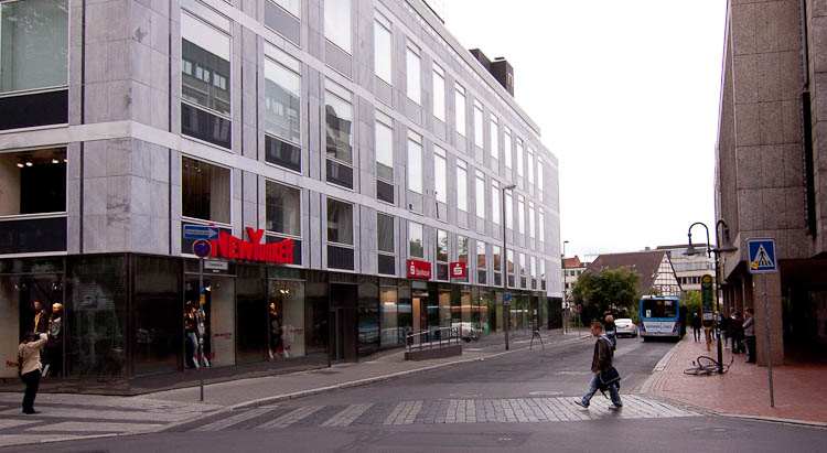 Blick von der Weender Strasse: links die ehemalige Sparkasse, jetzt New Yorker, hinter dem Buss die Stokeleff-Mühle, rechts das Carre. |