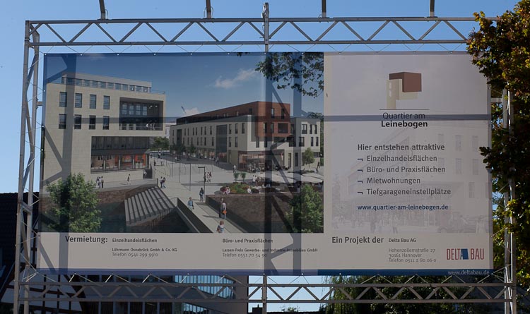 Anfang Oktober 2010 stellte die "Delta-Bau" aus Hannover Modell und Computeranimation ihrer Pläne vor (siehe GOEST , GT vom 9.10.2010, S. 9) und platzierte ein grosses Bild am Bauort - nur eben seitenverkehrt! Das Bild ist vom Waageplatz aus gesehen, es hängt aber in der Achse Jüdenstr./Stumpfebiel! Ist nur zu hoffen, dass das sonstige Vorgehen von "Delta-Bau" weniger fehlerhaft sein wird ..... Gepant sind der Baubeginn im Frühjahr 2011 und der Bezug für den Herbst 2012. Der GT-Artikel bietet einen Link auf das Bild, das dem Plakat zugrundeliegt. Den Artikel aufzurufen lohnt sich auch wg. der Sprechblasen, etwa von der "neuen Verbindungsachse zum Bahnhof". |