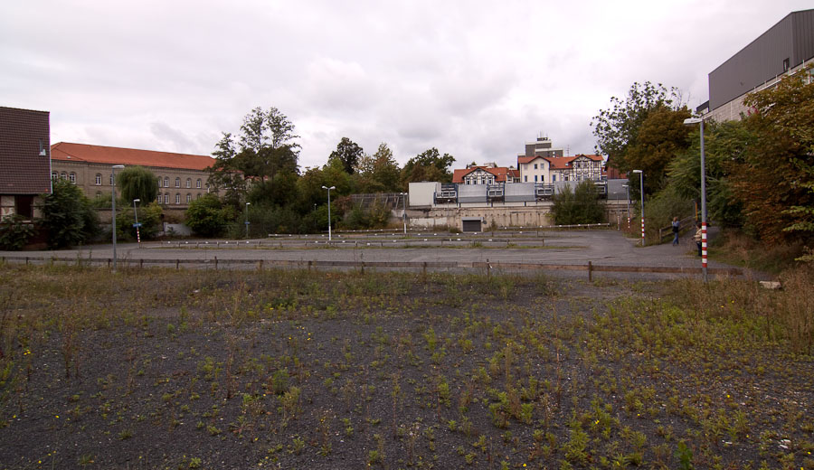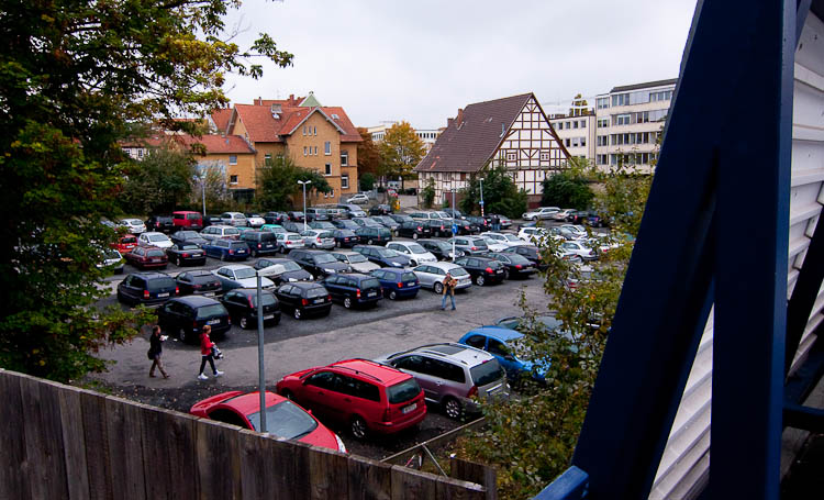 Blick vom Carre-Parkdeck auf den Parkplatz im Oktober 2009 - hier stand mal das Hallenbad |