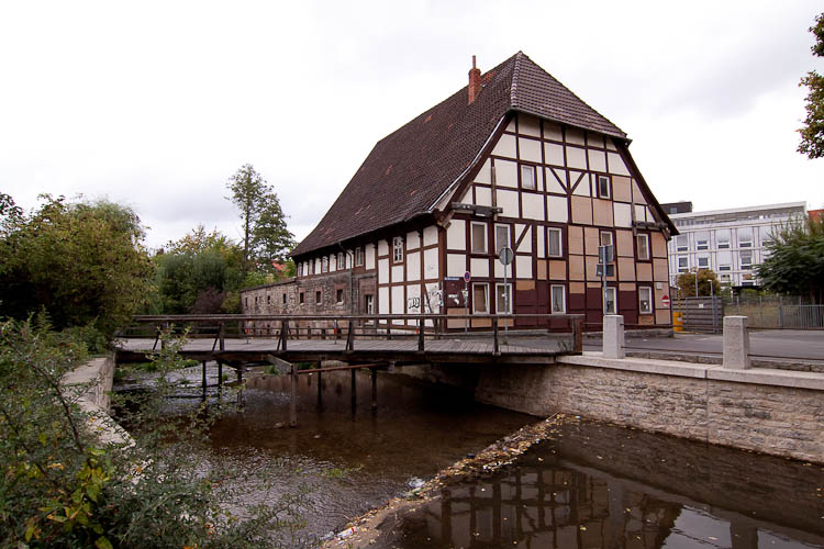 Leinekanal und Stokeleff-Mühle, rechts im Hintergrund das ehemalige Sparkassengebäude. Die Brücke im Vordergrund über den Leinekanal soll abgerissen werden. |