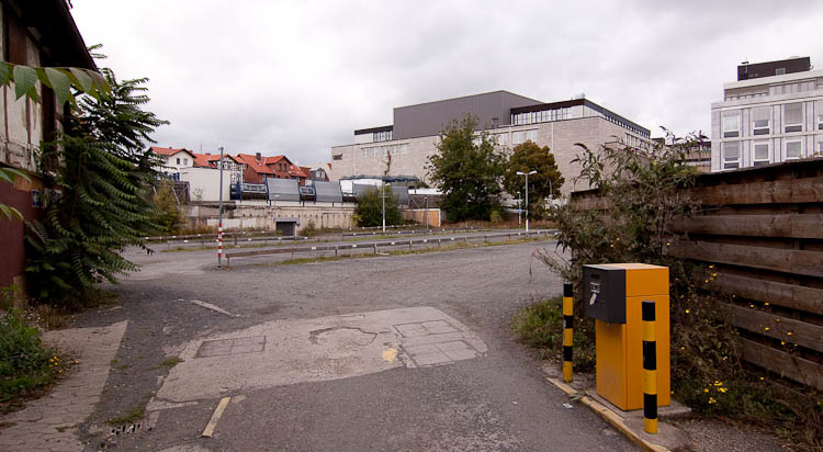 Der Gegenschuss: links die Stokeleff-Mühle, dann Parkdeck, Carre und Rückseite des ehemaligen Sparkassengebäudes. Der Parkplatz soll weitgehend bebaut werden. |