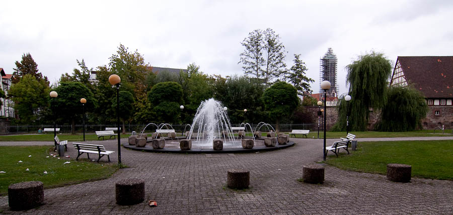 Blick vom Waageplatz nach Osten: links die Häuser von der Reitstallstrasse, dann hinter den Bäumen das Carre und der eingerüstete Turm der Jakobi-Kirche, schließlich rechts die Stokeleff-Mühle. An deren linker (Nord-)Front, wo jetzt die Weiden zu sehen sind, soll eine neue Brücke den Leinekanal überschreiten. Damit gäbe es eine durchgehende Verbindung vom Stumpfebiel (zwischen Carre und ehemaligen Sparkassengebäude) durch eine Bebauungslücke auf dem jetzigen Parkplatz an der Mühle vorbei über die neue Brücke bis zum Waageplatz. |