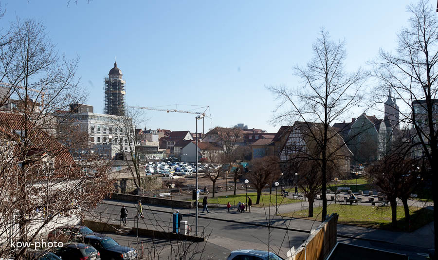 Blick vom Waageplatz Richtung Stumpfebiel; im Hintergrund der Jakobi-Kirche im Baugerüst