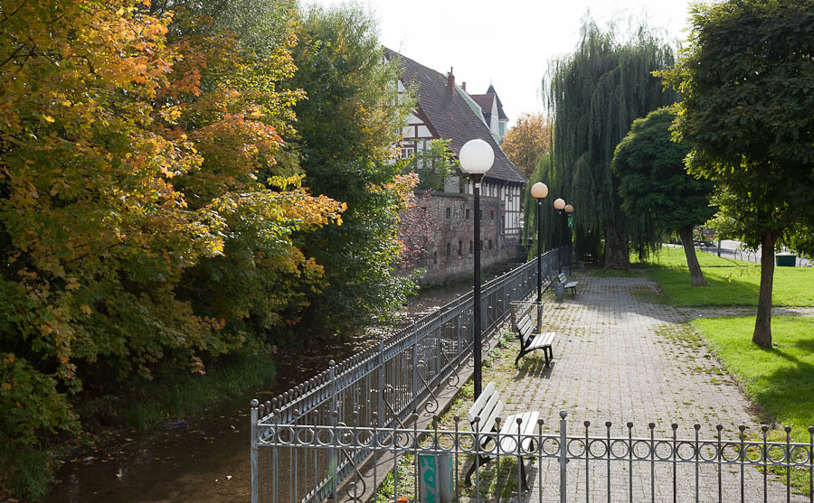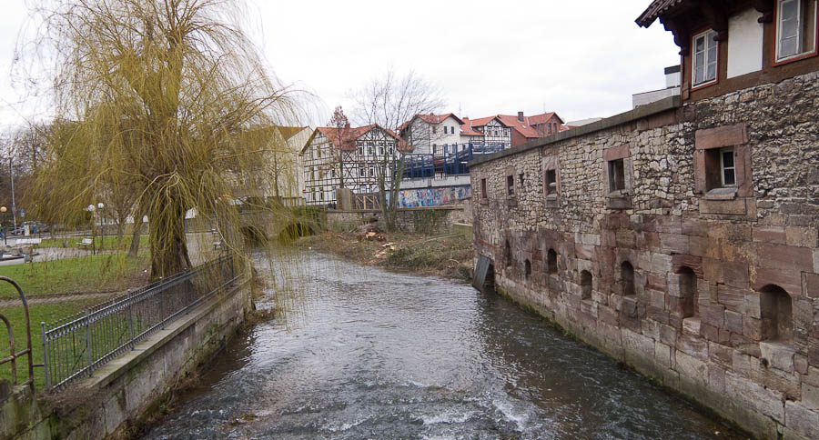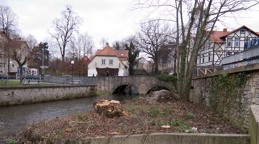 Von der Reitstall-Brücke leinekanalaufwärts. Vor der Restmauer der Stokeleff-Mühle soll es eine neue Brücke geben.