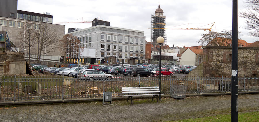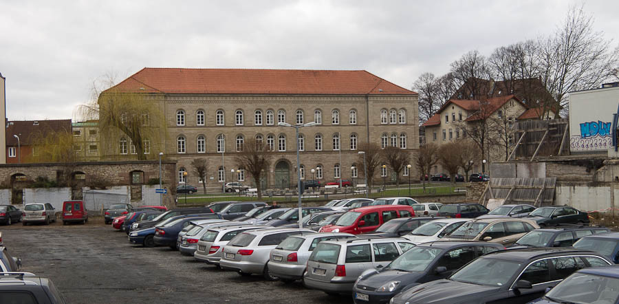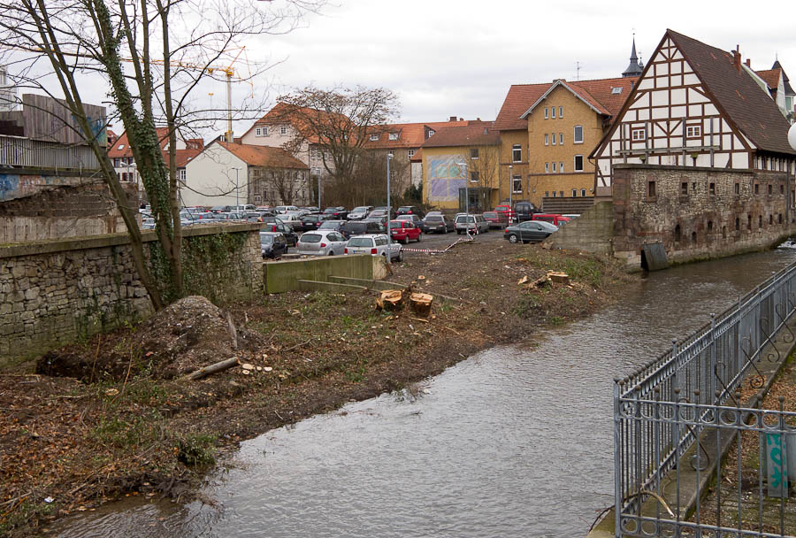 Blick vom Wall über die Reitstallstrasse und den Leinekanal auf den Rest-Parkplatz am 26.2.2011