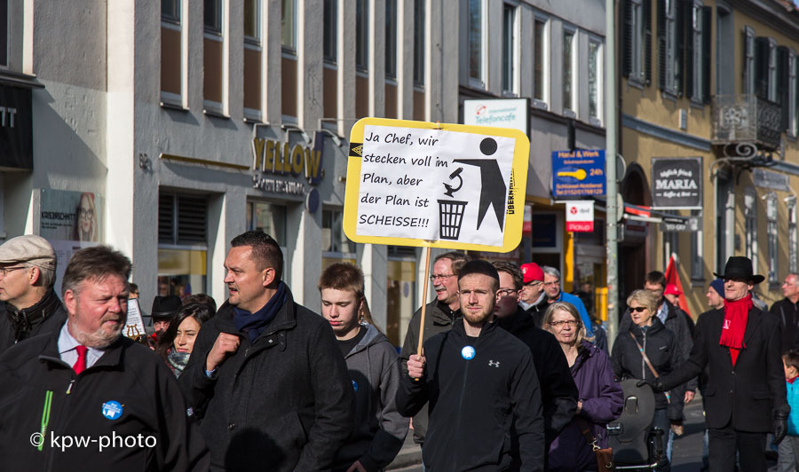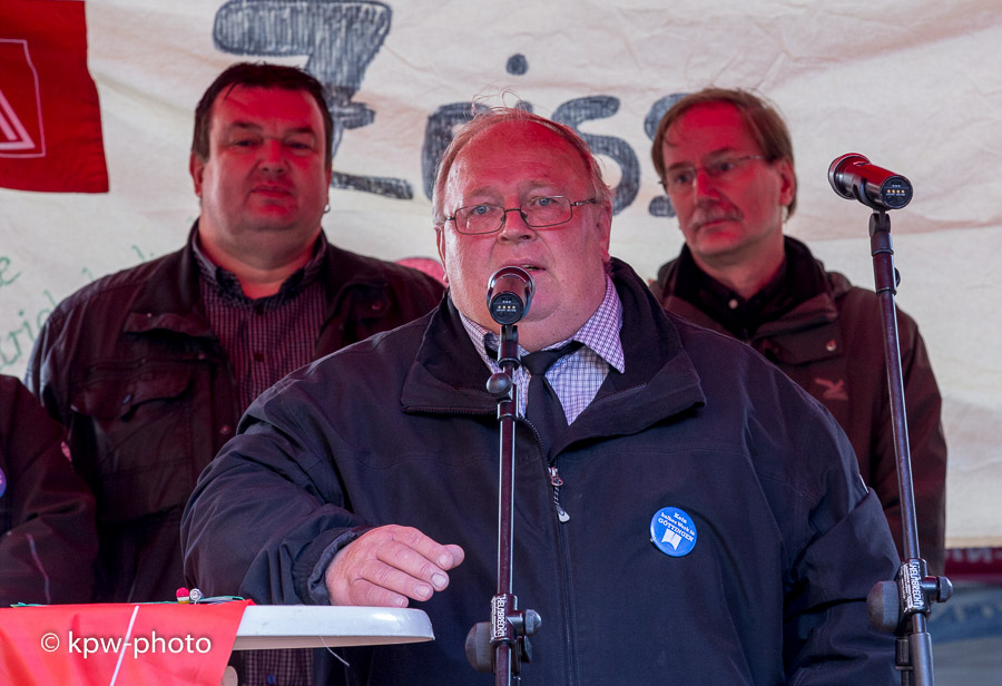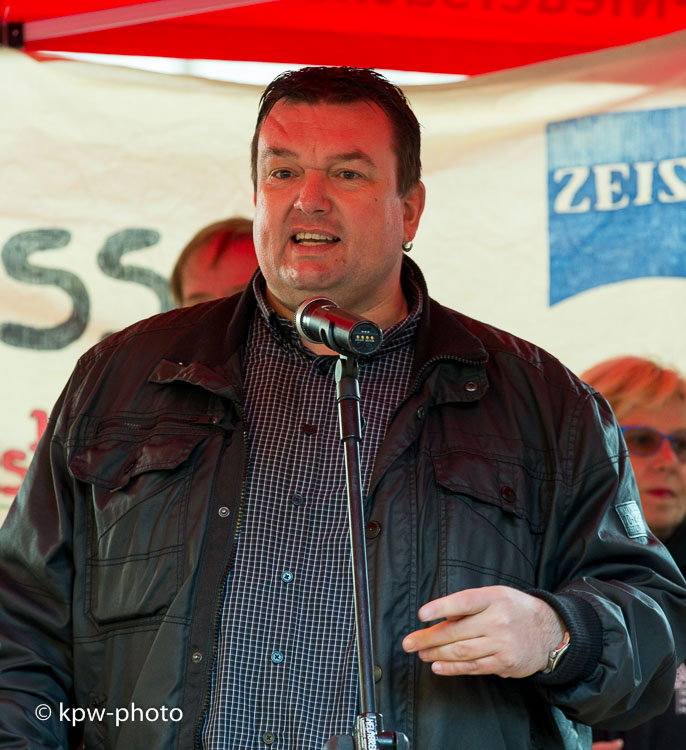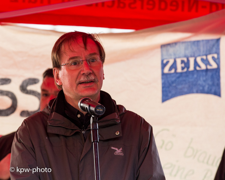 Die Prostestformen sind vielfältig: der stellvertretende Vorsitzende des Göttinger Zeiss-Betriebsrates, Reinhard Dickehuth, hat die Probleme und Forderungen der Belegschaft in Reimform gebracht und trägt sie am Rande der Demonstration immer wieder vor. |